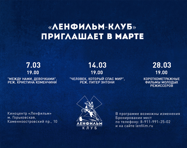 «Ленфильм-клуб» поздравляет всех с наступлением весны! Март принесет нам яркое солнце и плюсовую температуру, а морозы постепенно отступят. Мы же порадуем всех наших гостей весенней программой.