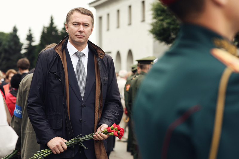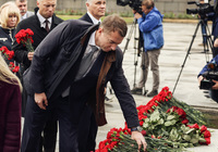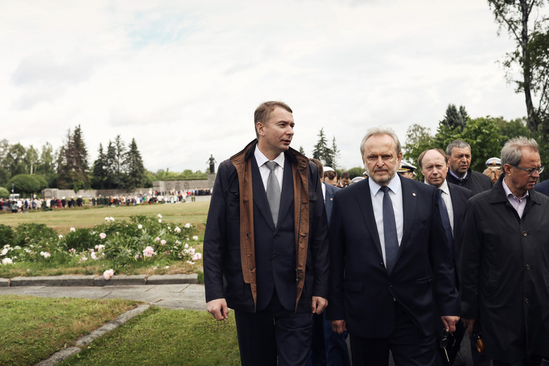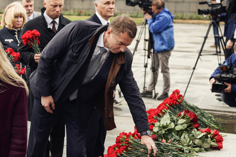 Там в память о погибших возложили цветы полномочный представитель президента в СЗФО Александр Беглов, губернатор Санкт-Петербурга Георгий Полтавченко, председатель Законодательного собрания Вячеслав Макаров, генеральный директор киностудии «Ленфильм» Эдуард Пичугин, делегации Западного военного округа, ветеранских и военно-патриотических организаций, курсанты военных училищ, воспитанники кадетских корпусов.