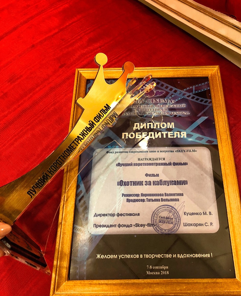 На VI международном кинофестивале «SkeyCinema», который проходил с 7 по 8 сентября в Московском доме национальностей, фильм «Охотник за каблуками» удостоен приза за «Лучший короткометражный фильм»!