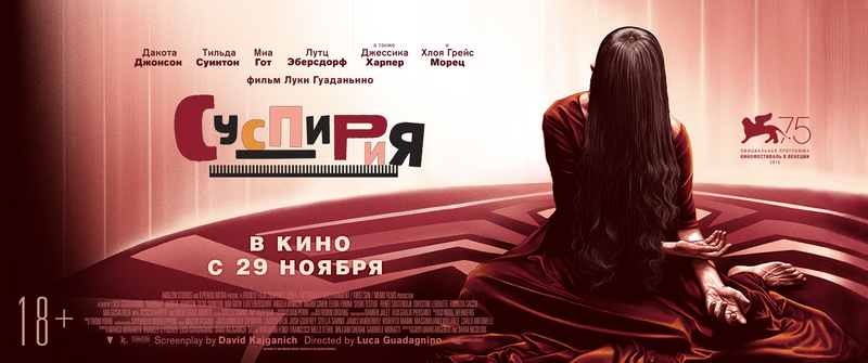 29 ноября в 19.00 на «Ленфильме» состоится специальный показ ремейка знаменитого итальянского фильма ужасов 1977 года с одноименным названием – «Суспирия» (18+).