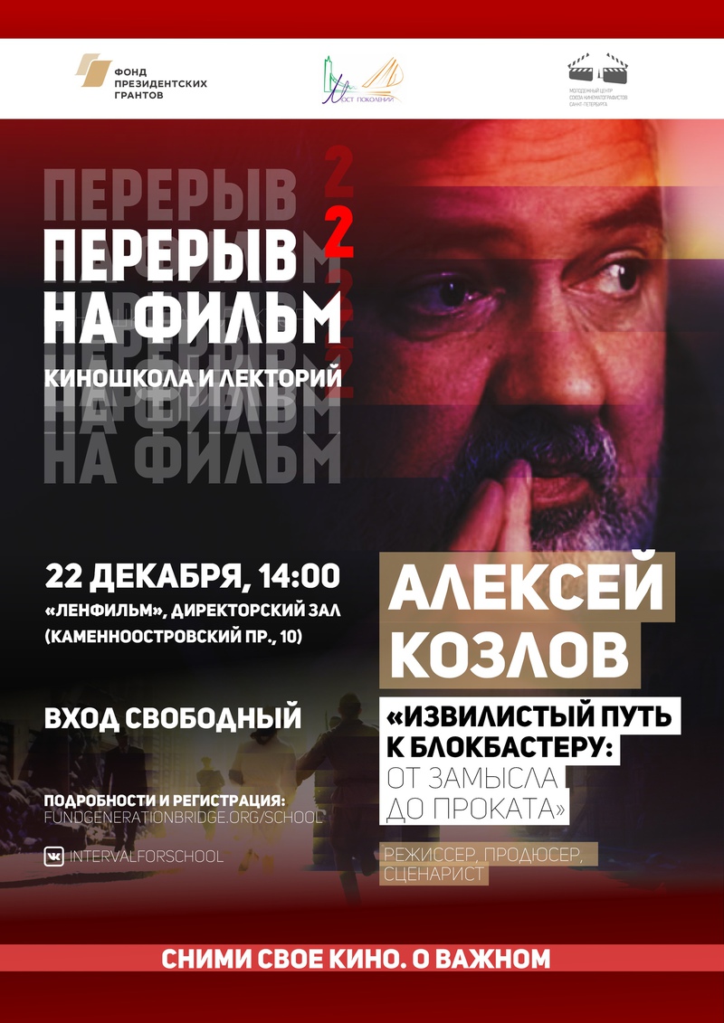 22 декабря в 14:00 в директорском зале киностудии «Ленфильм» в рамках открытия нового сезона кинолектория «Перерыв на фильм» состоится тематическая встреча с режиссером, сценаристом и продюсером нового отечественного фильма-катастрофы «Спасти Ленинград» Алексеем Козловым. Эту работу назвали «Русским «Титаником». В ней рассказывается история влюбленных, оказавшихся на барже, вывозивших людей из блокадного города.