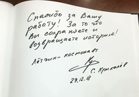 Крикалев встретился с генеральным директором киностудии Эдуардом Пичугиным. Гость рассказал о съемках «Космическая станция 3D» — первого 3D-фильма, снятого в открытом космосе. Например, как создавалась сцена со стыковкой шаттла, поделился опытом съёмок в условиях невесомости и многое другое. Во время показа «Космическая станция 3D», зрители путешествуют на околоземной орбите по Международной космической станции, узнавая множество любопытных фактов.