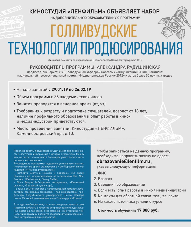 Набор объявлен в рамках деятельности Учебного Центра, созданного на базе киностудии «Ленфильм».