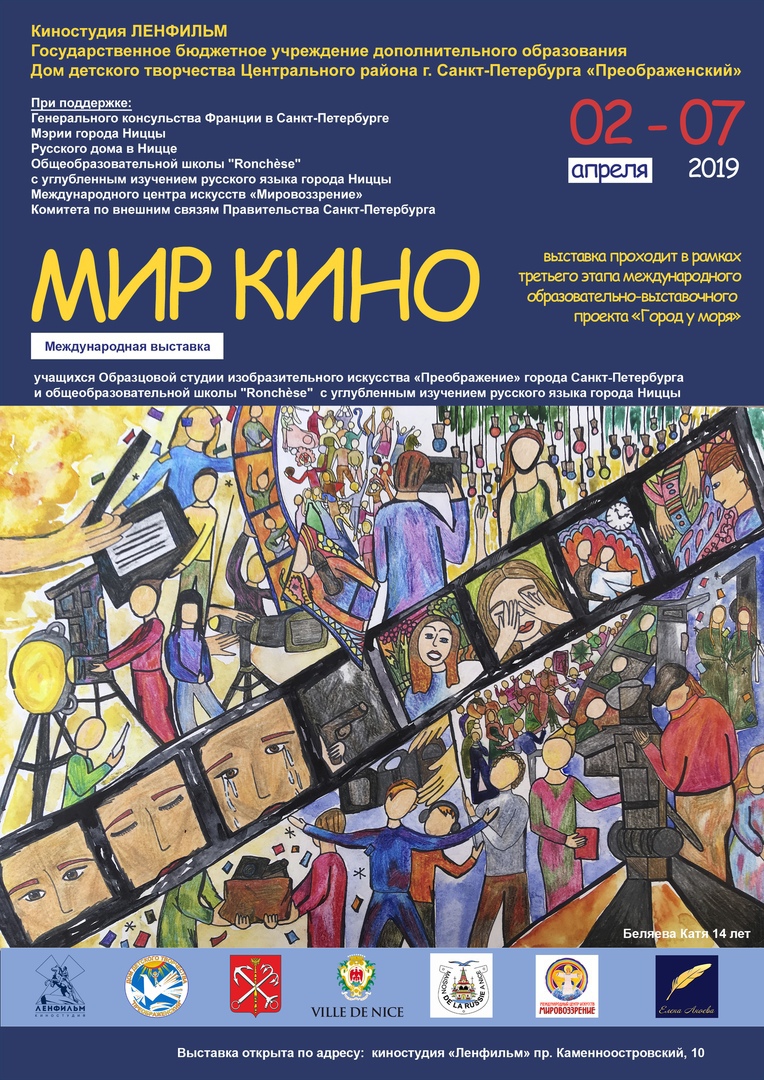 Выставка «Мир кино» – это результат третьего этапа российско-французского проекта «Город у моря», у истоков которого стоят некоммерческая культурная ассоциация «Русский Дом» (Ницца), Мэрия города Ниццы и Образцовая студия изобразительного искусства «Преображение» Дома детского творчества Центрального района Санкт-Петербурга «Преображенский».