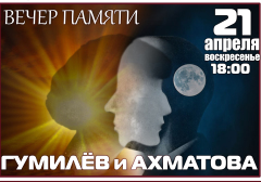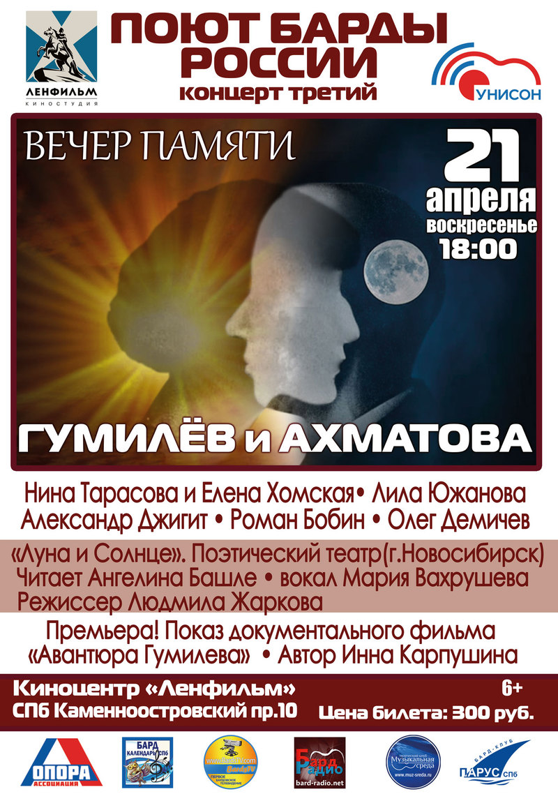 21 апреля в 18.00 в рамках проекта «Поют барды России» в киноцентре «Ленфильм» состоится вечер памяти Николая Гумилева и Анны Ахматовой.