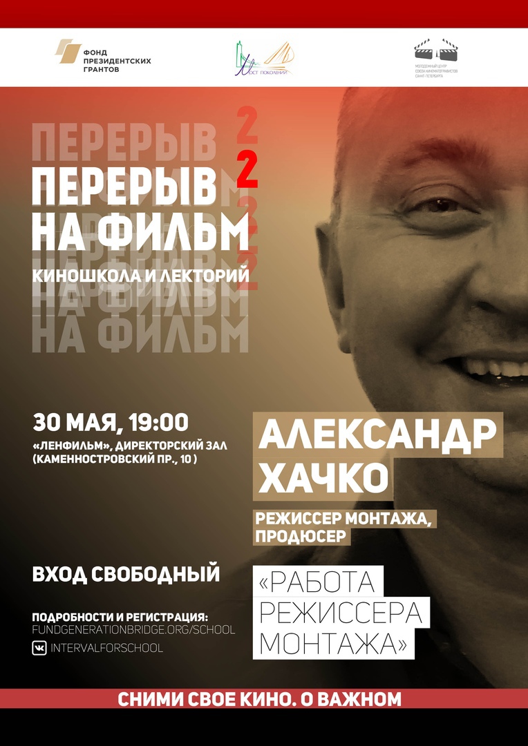 Новая встреча, посвященная режиссуре монтажа состоится 30 мая в 19:00 в директорском зале Киностудии «Ленфильм».