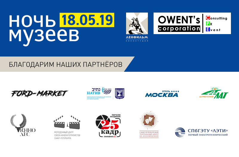 Благодаря усилиям всех участников киностудия смогла выдвинуться в лидеры «Ночи музеев». «Ленфильм» вместе с OWENT’s Corporation благодарит партнеров, которые сделали эту ночь незабываемой: