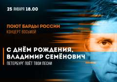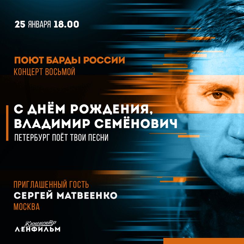 25 января в 18:00 в день рождения Владимира Высоцкого Петербург услышит знаменитые песни автора. В рамках проекта «Поют барды России» в Киноцентре «Ленфильм» выступит один из лучших бардов России Сергей Матвеенко.