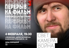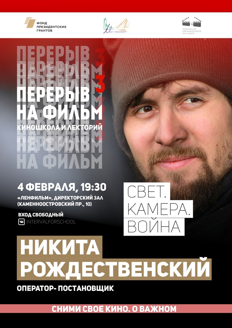 4 февраля в 19:30 в директорском зале киностудии «Ленфильм» состоится первая в 2020-м году встреча кинолектория «Перерыв на фильм» под названием «Свет. Камера. Война». Посвящена она будет операторскому делу: гостем лектория станет Никита Рождественский – оператор, в чьем послужном списке целый ряд картин, связанных с темой Второй Мировой войны.