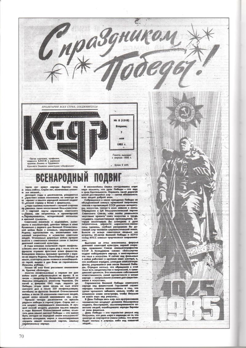 Как многие многотиражки, а затем и многие известные газеты, «Кадр» прекратил свое существование. Но ему на смену пришел новый интернет-формат – официальный информационный сайт «Ленфильма», массовые группы в социальных сетях. Мы можем общаться, обмениваться мнениями и чувствовать себя в едином информационном пространстве. А значит быть вместе, ведь жизнь на студии продолжается – кадр за кадром.