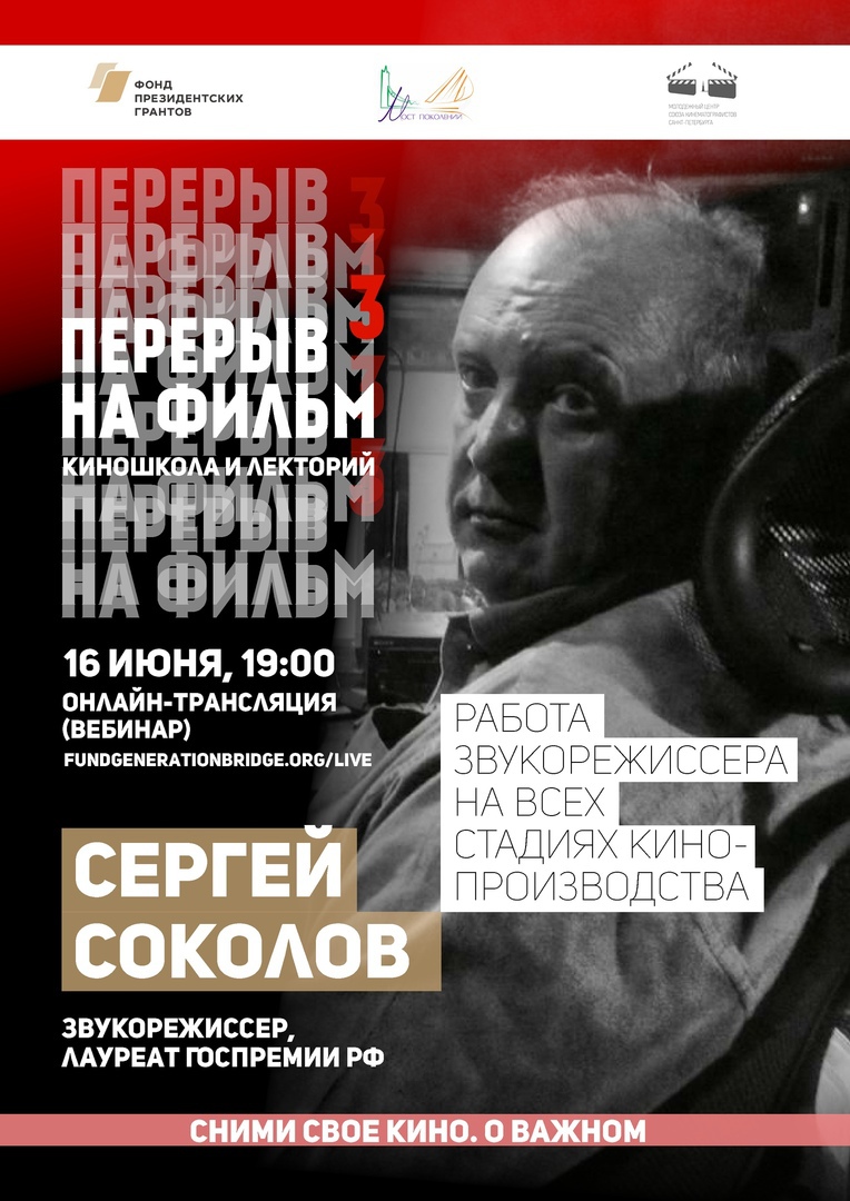 Во вторник, 16 июня, в 19:00 гостем онлайн-лектория «Перерыв на фильм» станет Сергей Соколов, который расскажет об особенностях работы звукорежиссера на трех стадиях кинопроизводства — подготовительной, съемочной и на постпродакшн. Отдельной темой станет работа над фильмом «Кукушка».