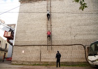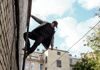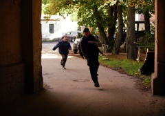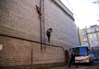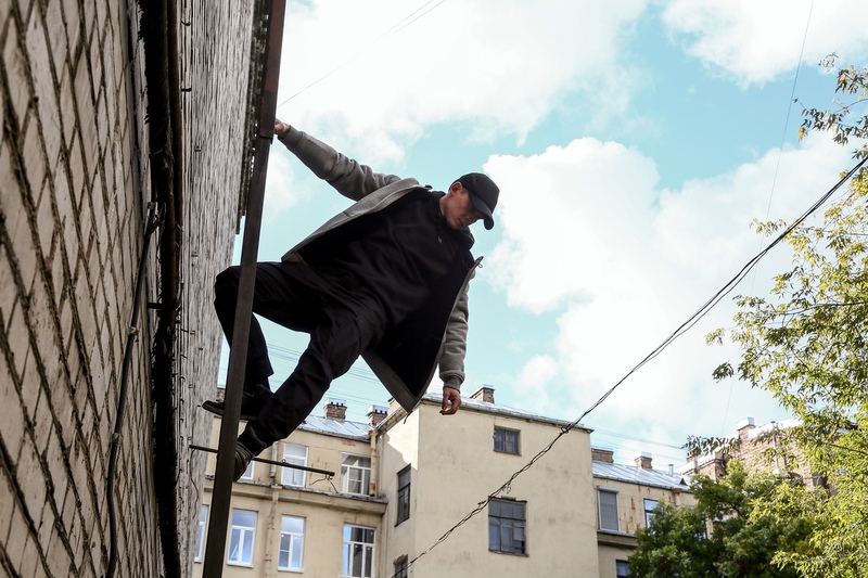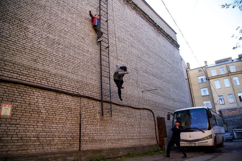 На «Ленфильме» можно увидеть съемки экшен сцены. Сотрудник преследует бандита. Подозреваемый пытается сбежать по крыше, забираясь по лестнице, но… соскальзывает. Его «тело» пролетает мимо камеры, а результат падения мы можем прочувствовать через эмоции преследователя, чей крупный план мы видим на экране. Конечно же, трюк выполнял каскадер. Прицепленный к тросу, после падания он повисал в воздухе.