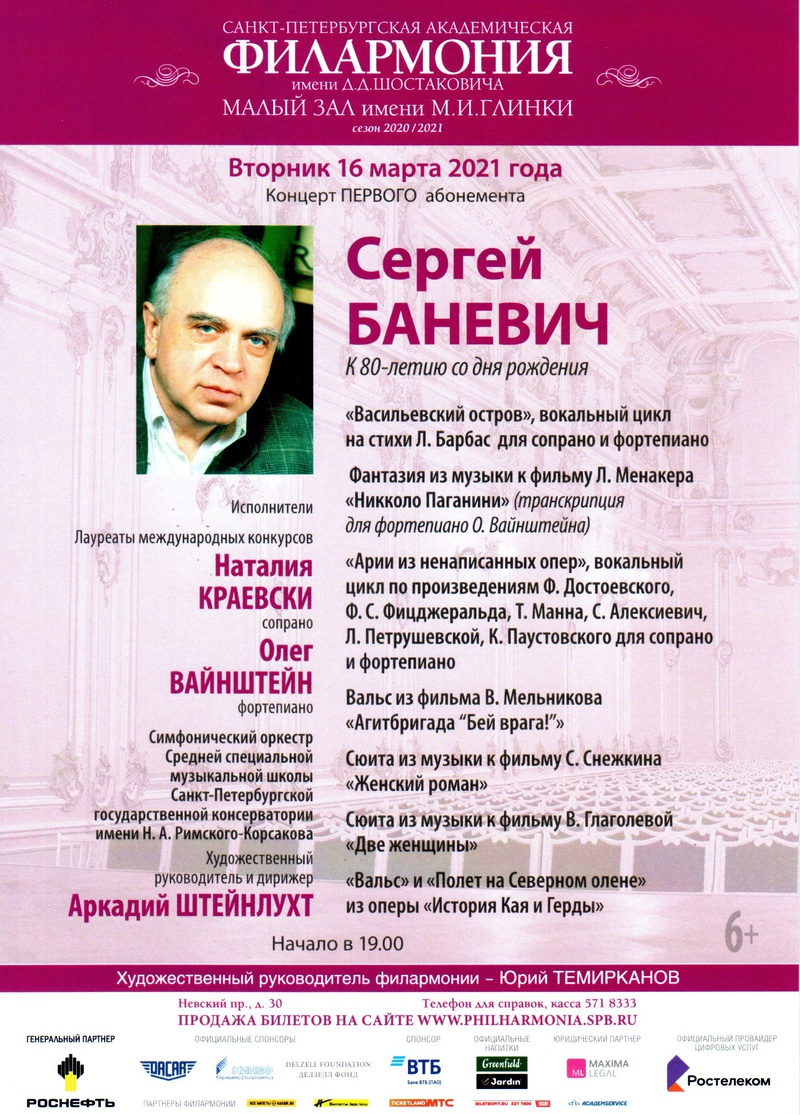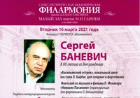16 марта в 19:00 в Малом зале Филармонии состоится концерт, посвященный 80-летию известного композитора Сергея Баневича.