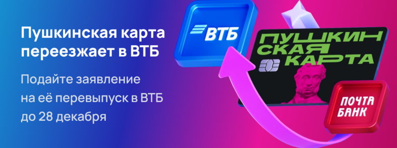 Уважаемые посетител, информируем вас ,что с 1 января 2026 года роль оператора программы «Пушкинская карта» переходит к Банку ВТБ (ПАО). Данное решение связано с предстоящим в 2026 году прекращением деятельности АО «Почта Банк» ввиду присоединения к Банку ВТБ (ПАО).